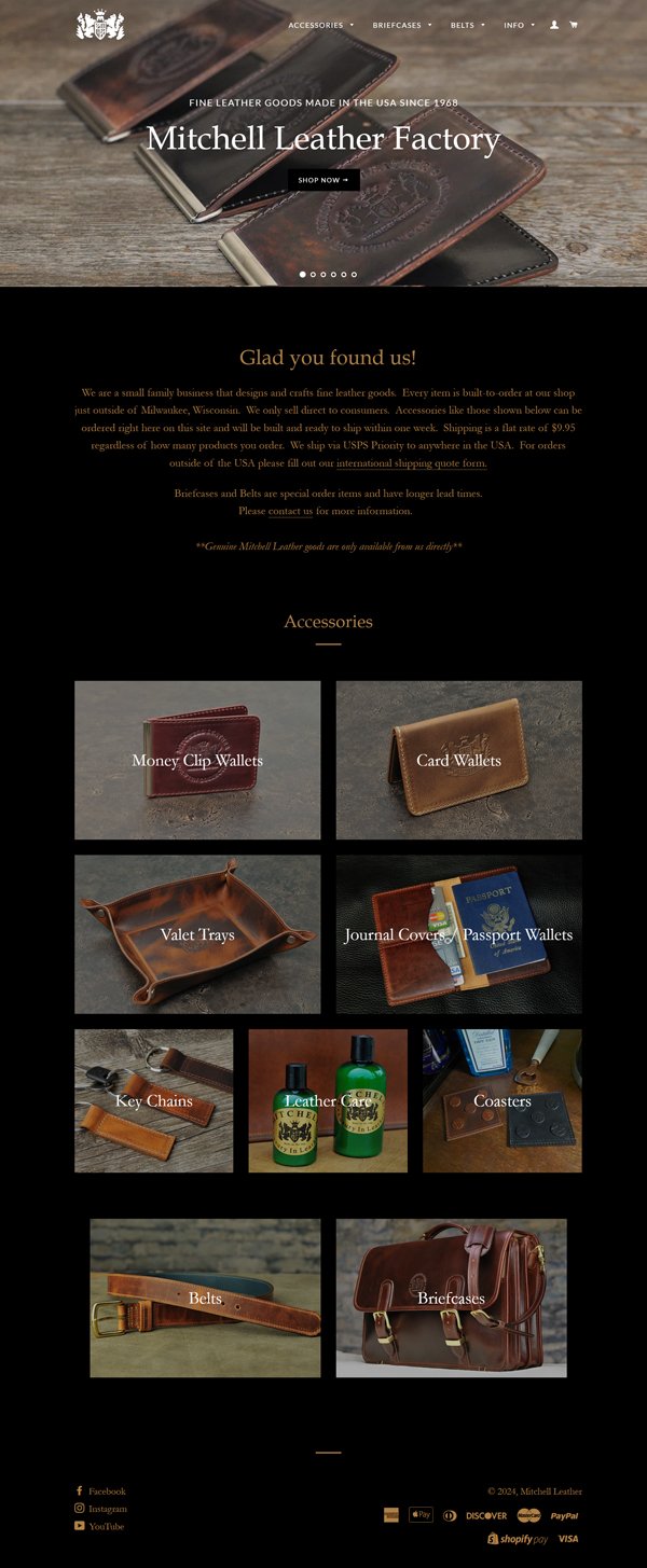 The final website mirrors Mitchell Leather Factory’s heritage — refined, timeless, and detailed.